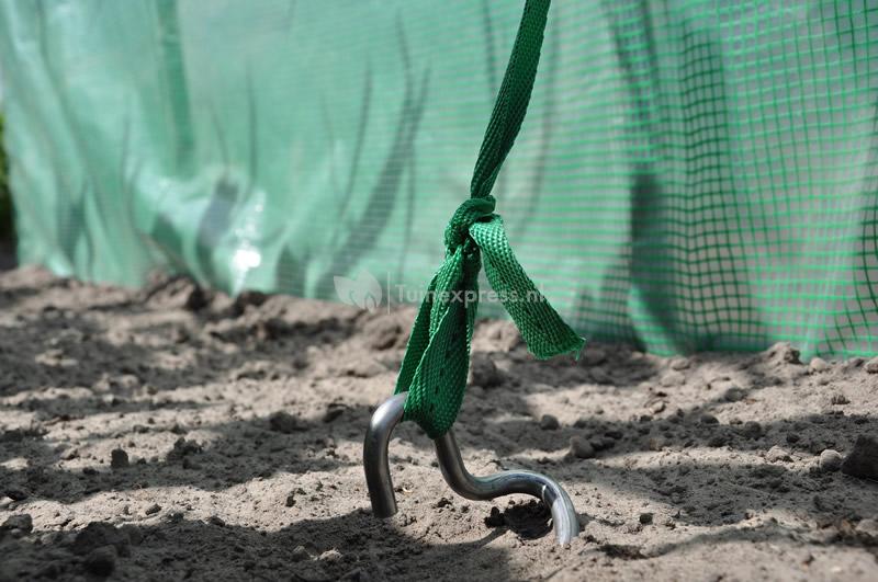 Grondankerset voor foliekassen Set voor het windvast verankeren van een foliekas. Grondankerset bestaande uit 4 stalen grondankers en 10 meter spandband. Specificaties: